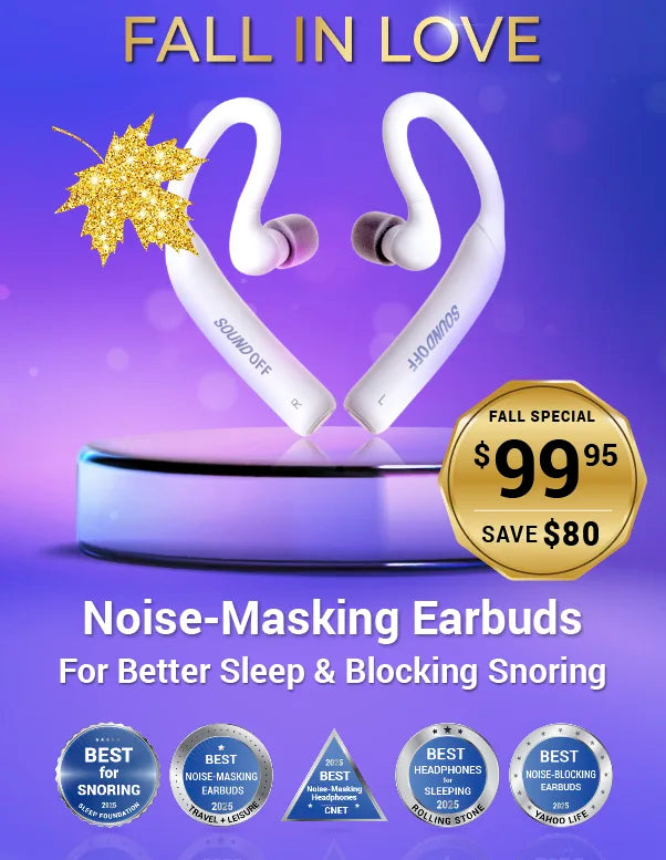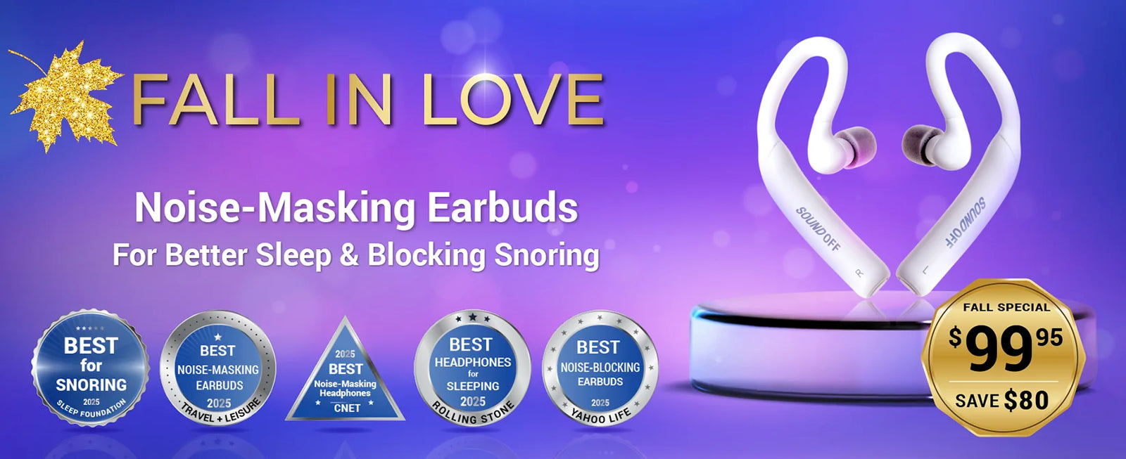Active Noise Masking is the sound you listen to so you don't hear snoring or other annoying sounds. With SoundOff Sleep earbuds you hear soothing Pink Noise.